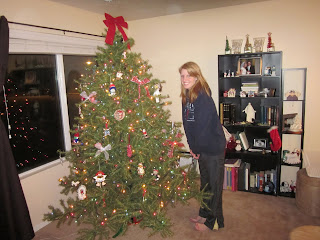 Last Sunday, November 27th, Andy and I stayed home after church instead of going to the in-laws. We made some turkey rolls, using the left over turkey, and enjoyed a quiet dinner. After Andy went through some of his old boxes, we started to decorate our house. I actually put up the tree the day before. We got it from a teacher at my school, who got a new one that came pre-lit. Andy did have to help me fix part of the top that I broke off when he got home from work. It sure is nice to have a handy husband.